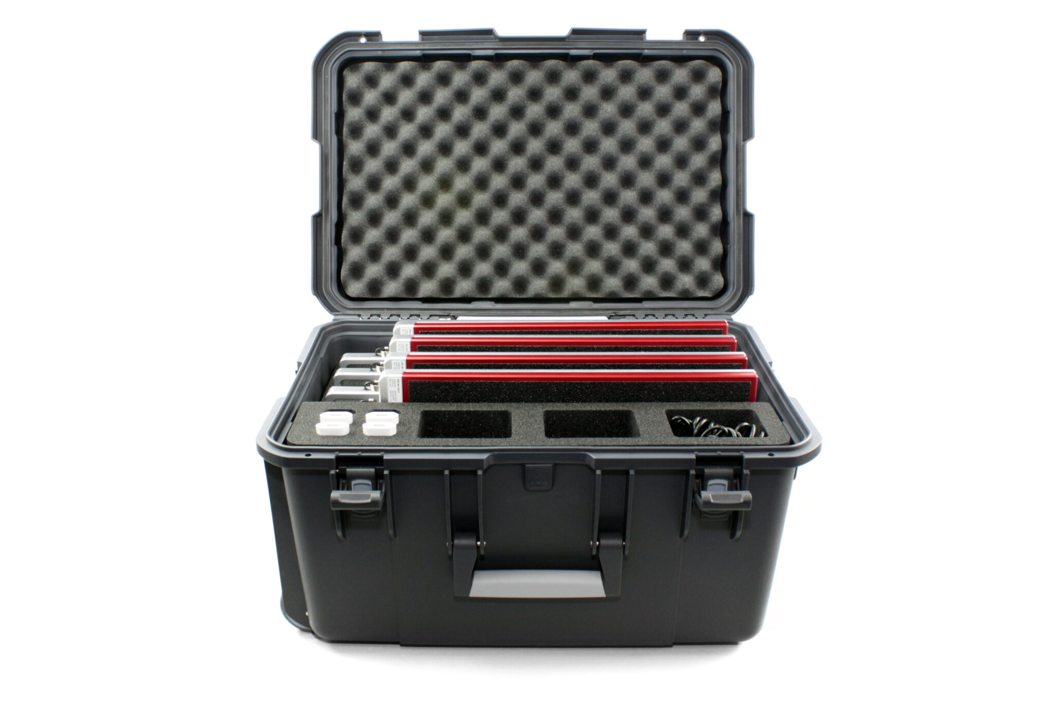 Geöffneter Transportkoffer mit eingeräumten IFX Waagen und Zubehör von vorne